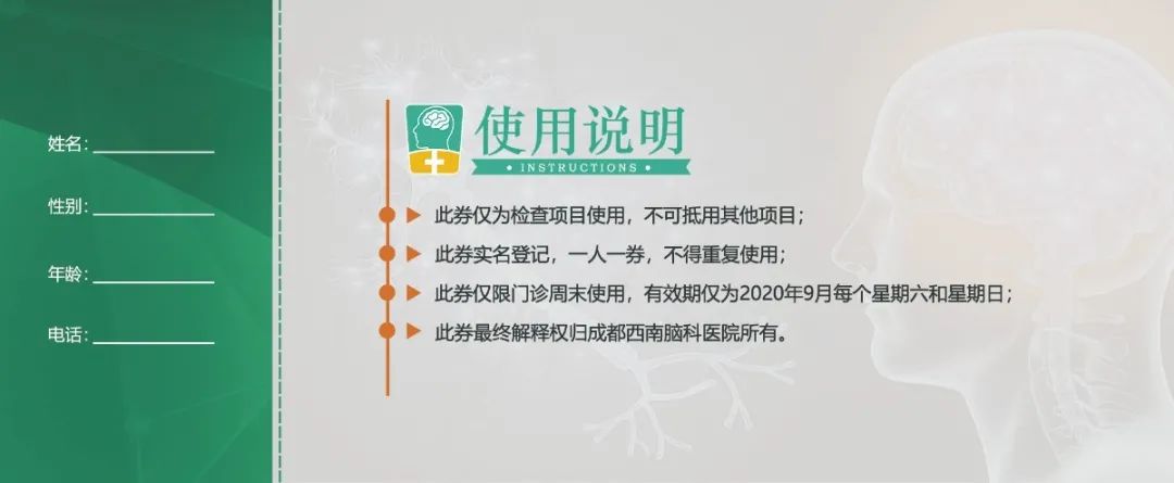 大脑是人体较重要的器官,然而现代社会生活节奏加快,人们往往忽略了大脑健康,当出现头疼、头晕、肢体不协调时,才想到去医院做脑部检查。其实,对于大部分人群来说,早期进行“脑健康”体检,可防范于未然。为此,我院将根据不同人群需求制定相关脑科筛查项目。脑健康月活动期间,到院即可领取脑病专项检查200元抵用券,仅限周末使用。