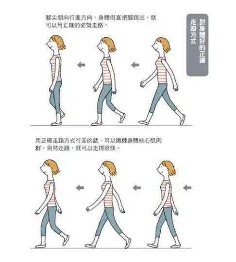 正确的走路姿势应该是,两只眼睛正向前看,头部略微抬起,颈部保持直立,胸部自然向前,腰部平直,下腹部和臀部向后略微突出。将低头俯工作的状态转变为抬头走路的状态,可以补偿头部长期工作和血液循环不畅引起的紧张,为大脑提供休息。