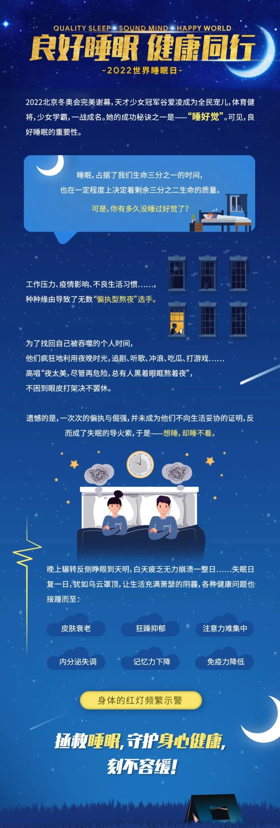 3.21 世界睡眠日,世界卫生组织调查显示,27%的人有睡眠问题。为唤起全民对睡眠重要性的认识,国际精神卫生组织主办的全球睡眠和健康计划于2001年发起了一项全球性的活动,将每年的3月21日定为“世界睡眠日”,今年中国的主题是“良好睡眠,健康同行”。