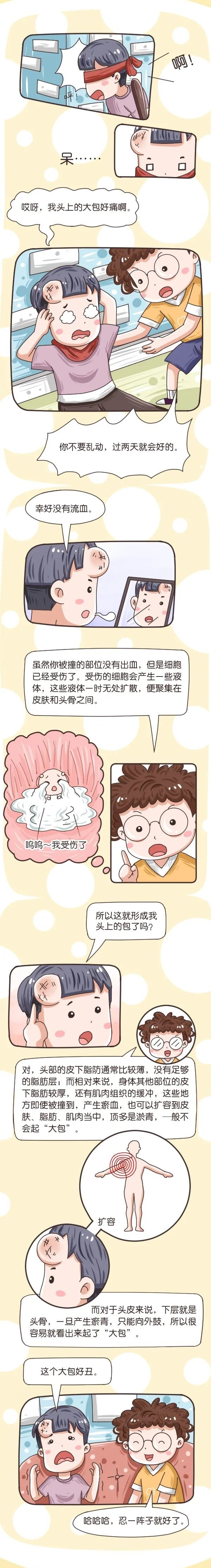 发生外伤后,头皮内毛细血管破裂,流出的血液无法扩散,便会聚集在头皮与头骨之间,同时被撞部位的软组织肿胀,细胞间液也会积聚,便会形成一个“大包”。