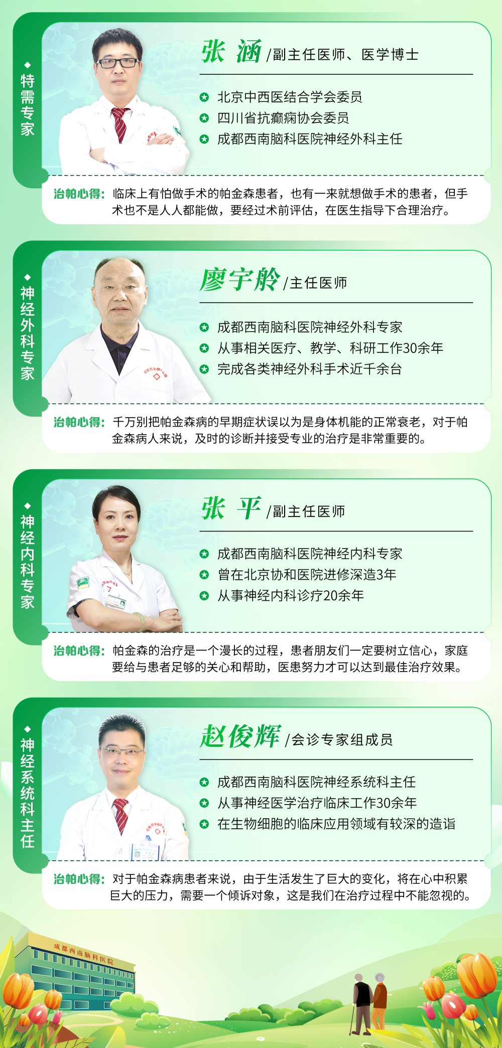 为此,成都西南脑科医院开展了第五届帕金森病友关爱公益活动,主题为“郁金香满衣,遇帕不再怕”。组织帕金森病多学科诊疗团队,帮助帕金森患者进行正规的治疗,重燃治疗及康复的希望。并启动“春暖花开,情系帕友”家访公益行,组织医护团队走进帕金森患者的生活,给予帕金森患者更多实质性的帮助。