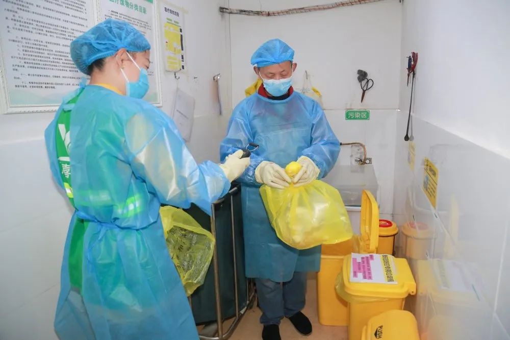 医院大厅及各科室均设有新冠防控专用垃圾桶,每天上班前,保洁工会在打包垃圾时贴上相应的条形码,收运员收运下楼后,扫码,过秤后数据直通处理中心。