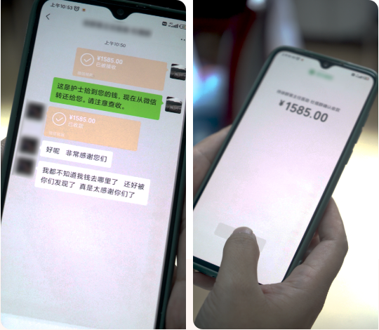 事后,张晓梅告诉我们,患者来看病已经花了不少钱了,一千多块钱也不是小数目,肯定是要给患者还回去的。张婧护士长迅速通过微信联系上了患者,由于患者已经出院,来一趟医院也不容易,便将1585元通过微信转账给了患者。